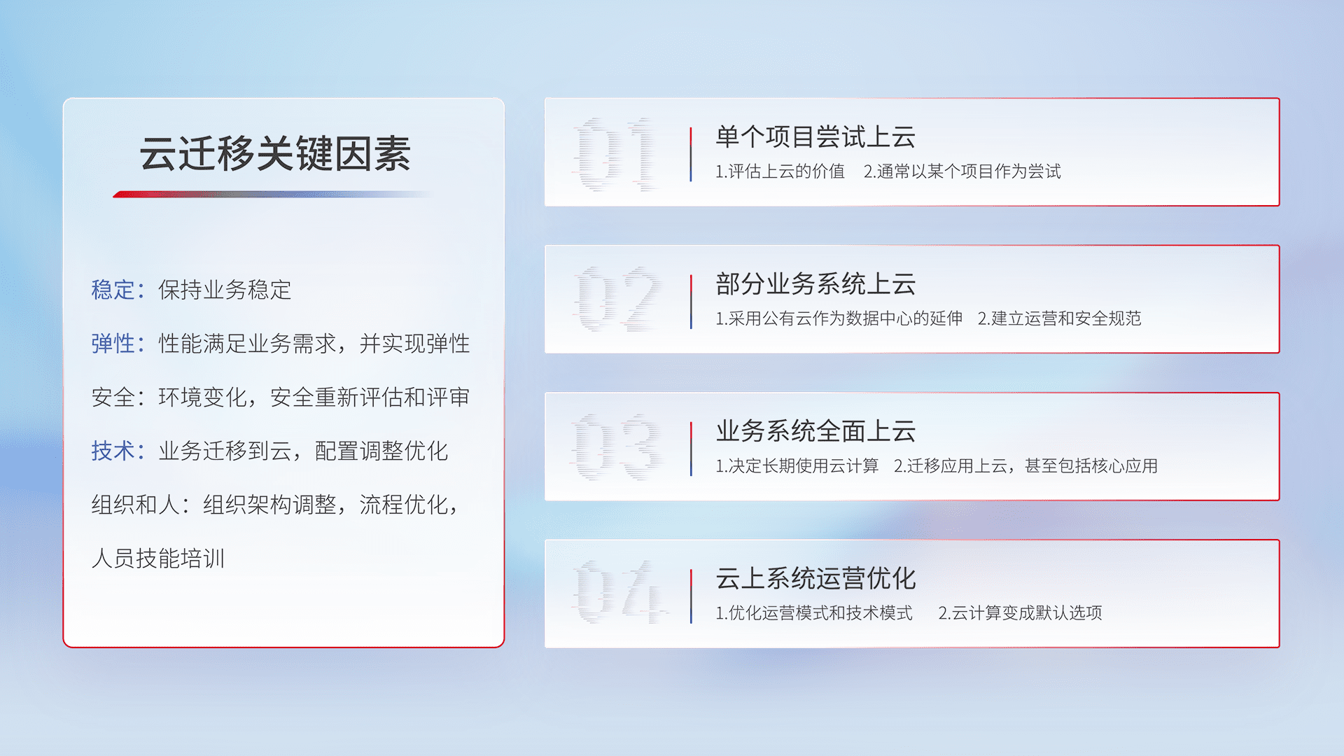 结合实际业务,,从规划设计、、、云平台选型、、、、云原生改造、、、、数据迁移、、、集成交付,,迁移全过程为客户识别最佳上云路径,,,做好风险识别管理,,,设计网络架构、、、、身份权限、、、、安全审计合规、、操作审计、、日志审计、、、、监控告警策略、、、、多站点容灾设计等,,,,对云上基础设施进行整体规划,,,提升IT治理水平,,,,以满足弹性、、、高可用、、、高性能的需求。。