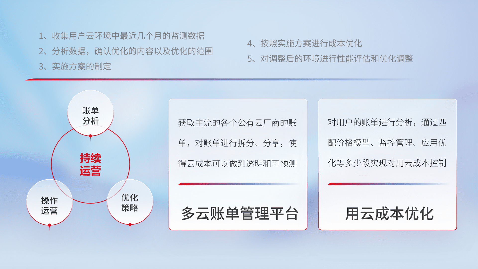 通过多云纳管,,,,以统一的资源数据模型把客户的云资源进行抽象和封装,,进而实现对多云资源的统一操作,,,保障云资源管理的可靠性、、、稳定性与可用性。。。。量身定制化运维内容,,配置、、、、开发运维、、、、补丁管理、、备份、、、监控、、、、认证和访问管理、、审计和日常巡检等,,保障在用云过程中的可靠度,,,稳定度以及高可用率。。